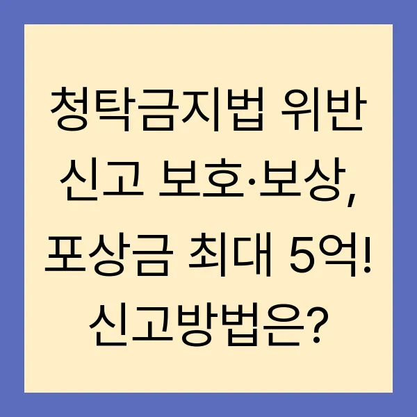 부정청탁? 금품수수? 혹시 주변에서 청탁금지법 위반으로 의심되는 상황을 목격하셨나요? 이제 망설이지 말고 신고하세요! 최대 5억 원 의 포상금과 신변 보호, 불이익 처분 시 원상회복까지! 신고 방법부터 보상 제도, 신고자 보호 절차까지, 청탁금지법 위반 신고에 관한 모든 것을 알려드립니다. 지금 바로 확인하고, 우리 사회의 투명성을 높이는 데 함께해 주세요!